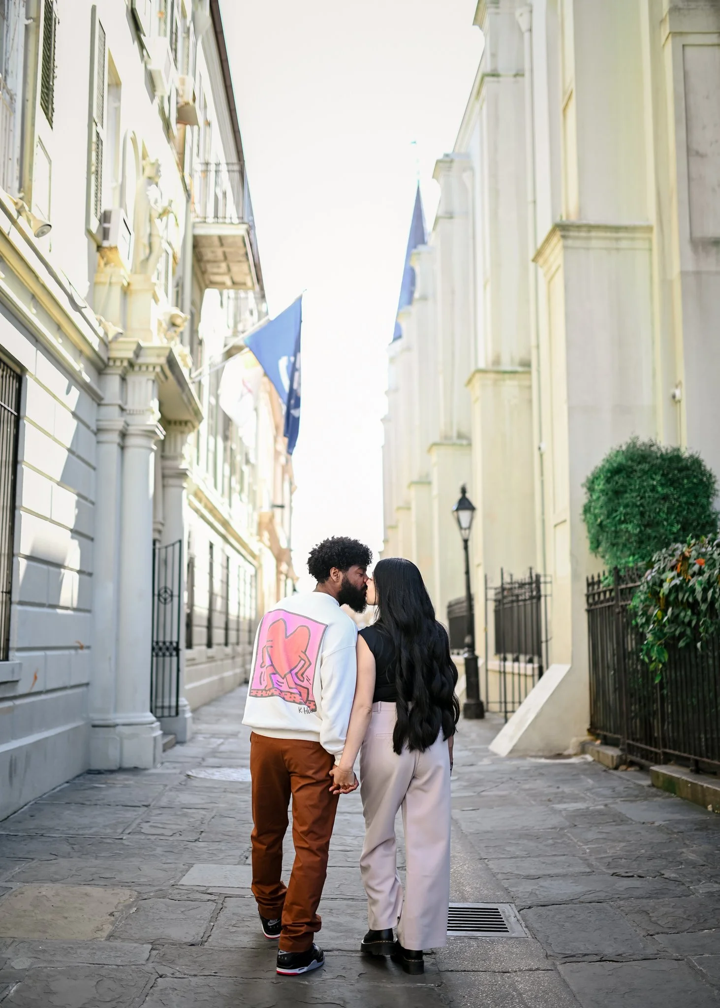 A couple holding hands and kissing while walking down a cobblestone street in a European-style neighborhood with tall, ornate buildings and flags.